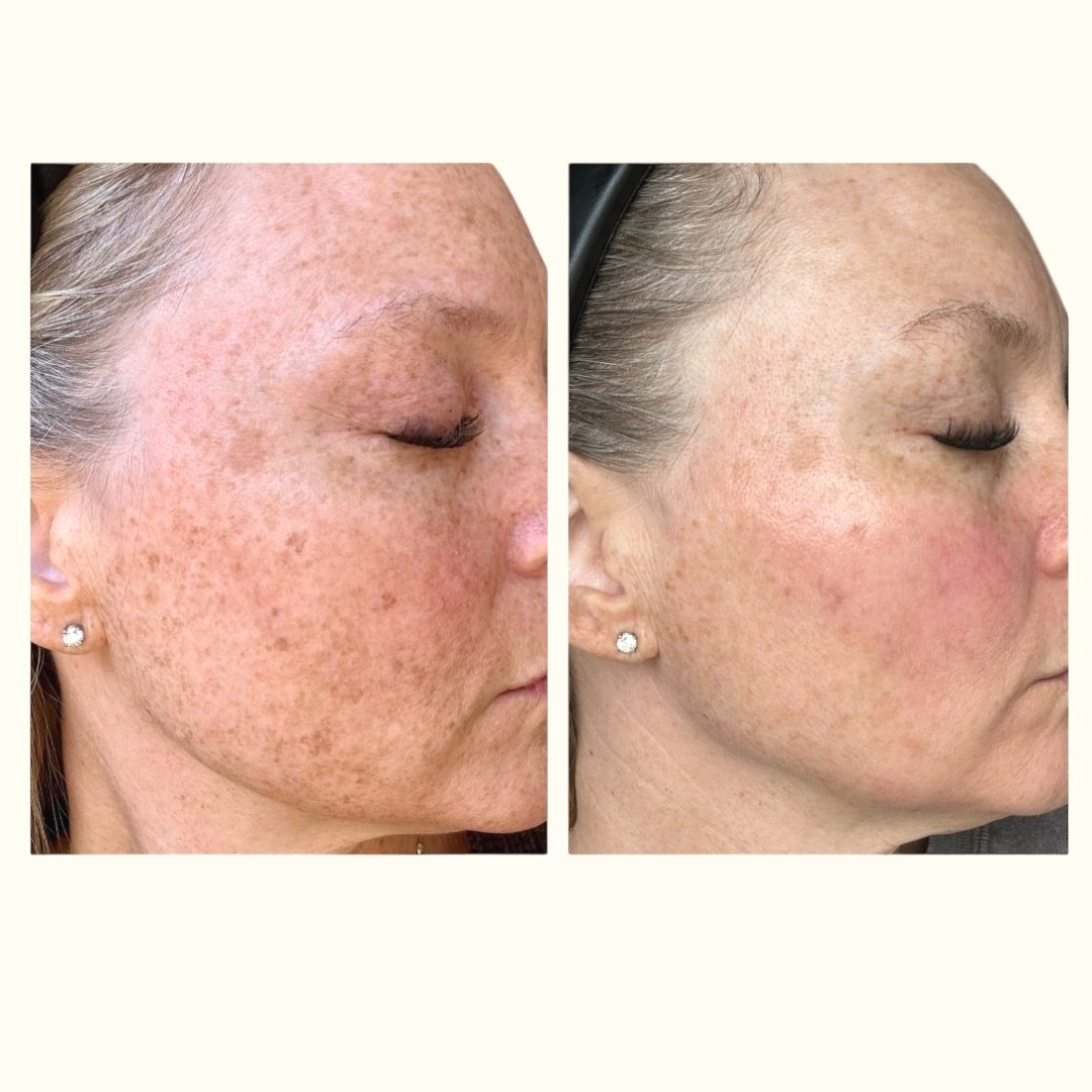 Side-by-side comparison of a woman's face showing reduction in freckles and skin pigmentation.