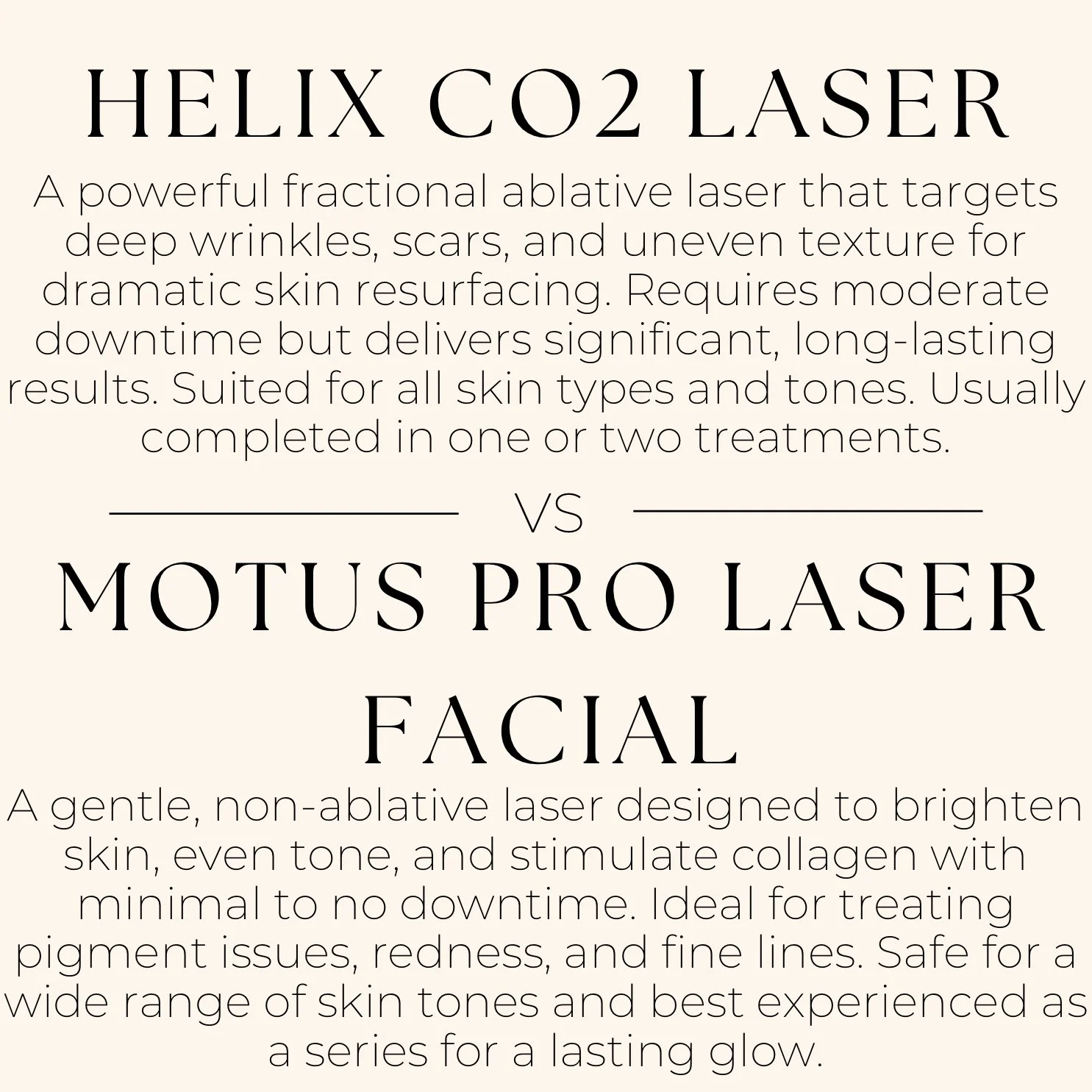 Comparison of Helix CO2 Laser and Motus Pro Laser Facial treatments, displaying descriptions of each procedure for skin rejuvenation and skin tone improvement.